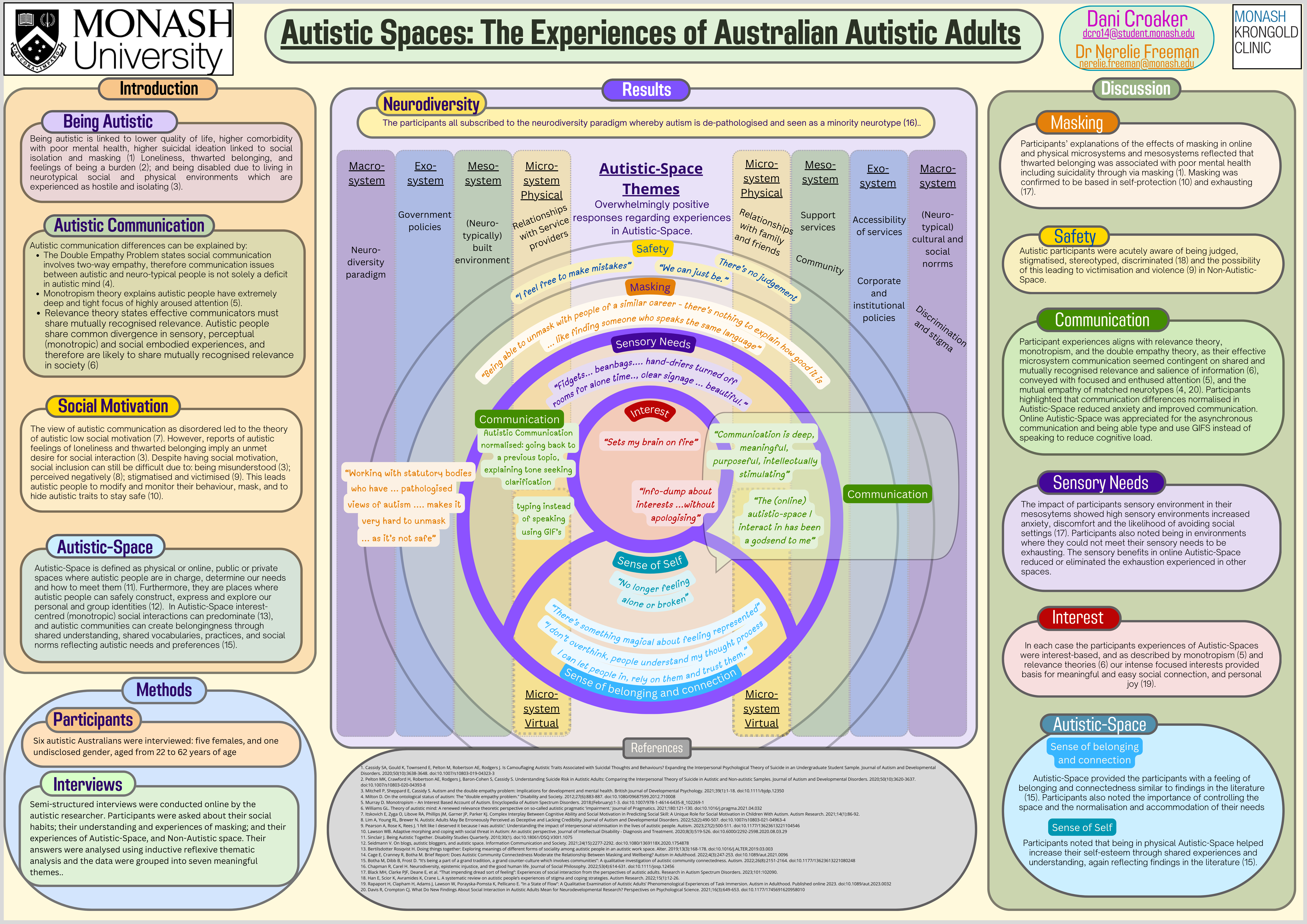 Dani supervised by Dr Nerelie Freeman presented a poster of their thesis at the International Society for Autism Research Symposium in Melbourne 2024. The qualitative research exploring the impact participation in autistic space has had on Australian autistic adults. Includes themes detailing positive impacts on wellbeing, communication, safety, interests, sensory needs, sense of connection and belonging, and sense of self. --- You can download the poster in the Downloads section below.